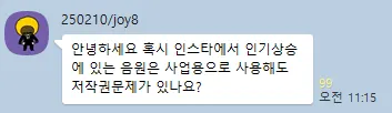 또한 음원마다 사용 허용 범위가 다를 수 있으므로, 걱정이 되신다면 해당 음원의 저작권 사항을 미리 확인해 보시는 것이 좋습니다.